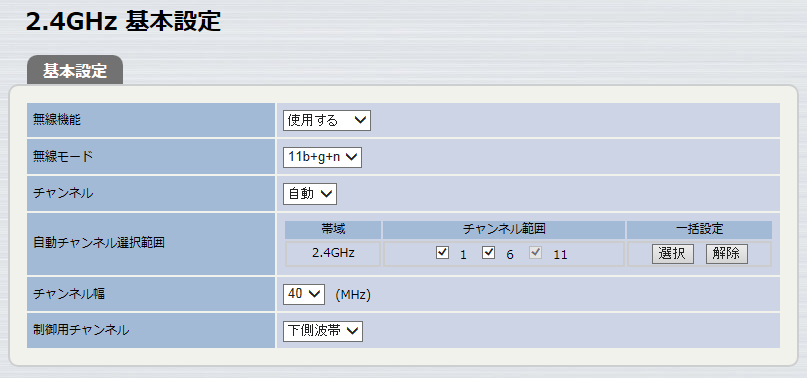 例えば、2.4GHz帯でチャンネルを自動に設定し、モードが11b+g+n、チャンネル幅が40MHz、制御用チャンネルが下側波帯の場合、