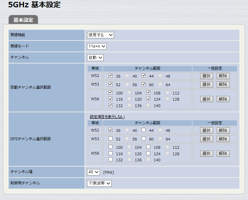 [無線設定] - [5GHz基本] の "自動チャンネル選択範囲" と"DFSチャンネル選択範囲"の項目で設定を行います。