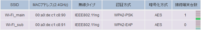 表示されたSSID情報は、SSID、MACアドレス(2.4GHz/5GHz)、無線タイプ、認証方式、暗号化方式、接続端末台数