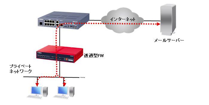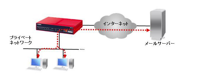 | ※ | LAN1インターフェース配下にメールサーバーを配置し、LAN2インターフェース配下にある端末からメールサーバーと通信する構成の場合は(4)の設定を以下に変更してください。 ip policy filter set 101 name="Internet Access" 2200 [2210 2220] 2250 [2260 [10000] 2270] 2300 [10050] 3000 |