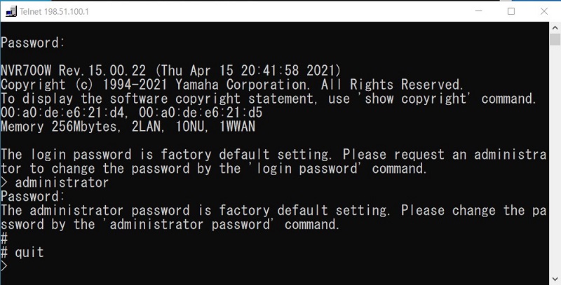 ここでは、Windows の TELNET を使用する場合を例に説明します。NVR700W, NVR510 の IP アドレスは 198.51.100.1 とした場合の例です。