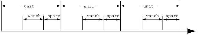 watch で示した間だけトラフィックを監視し、この間にパケットが流れなければ回線を切断する。spare は切断処理に時間がかかりすぎて、実際の切断が単位時間を越えないように余裕を持たせるために使う。