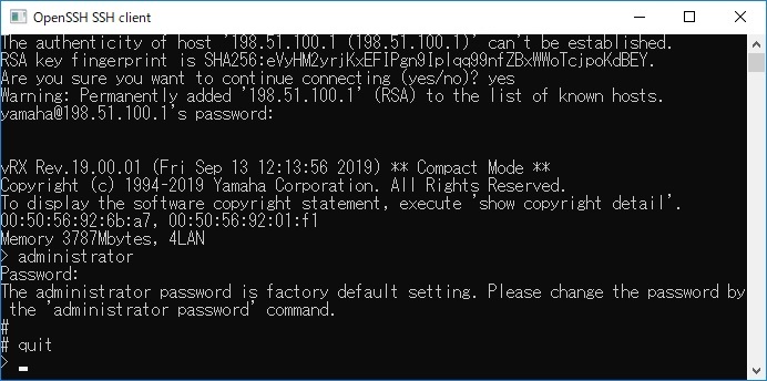 「yamaha@198.51.100.1's password:」と表示されたら、ログインパスワードを入力してから Enter キーを押します。