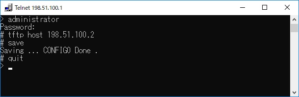 TFTP により設定ファイルをやりとりするためには、ヤマハルーター 側にあらかじめアクセス許可するための設定が必要です。まず tftp host コマンドを使用し、本機にアクセスできるホストを設定します。デプロイ時の設定ではどのホストからもアクセスできない設定になっていることに注意してください。
