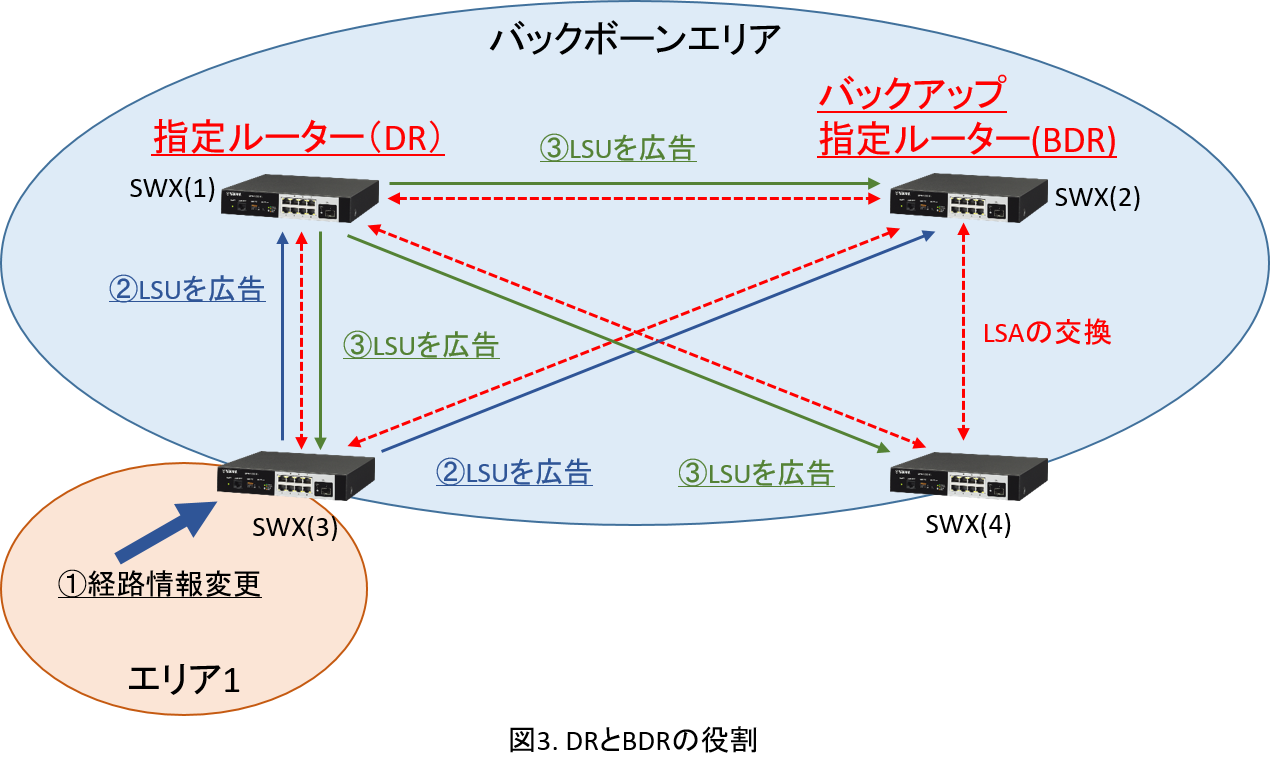 OSPFでは、マルチキャストがサポートされたネットワークにおいて、そのエリアに所属するOSPFルーターの中から指定ルーター (DR)とバックアップ指定ルーター (BDR)が選出されます。指定ルーターは、経路情報に変更があった場合にそれをエリア内のOSPFルーターに広告する役目を担います。その他の機器による経路情報の変更通知を無くすことで不要なLSAの交換を削減できます。指定ルーターがダウンした場合には、バックアップ指定ルーターが指定ルーターへと遷移します。