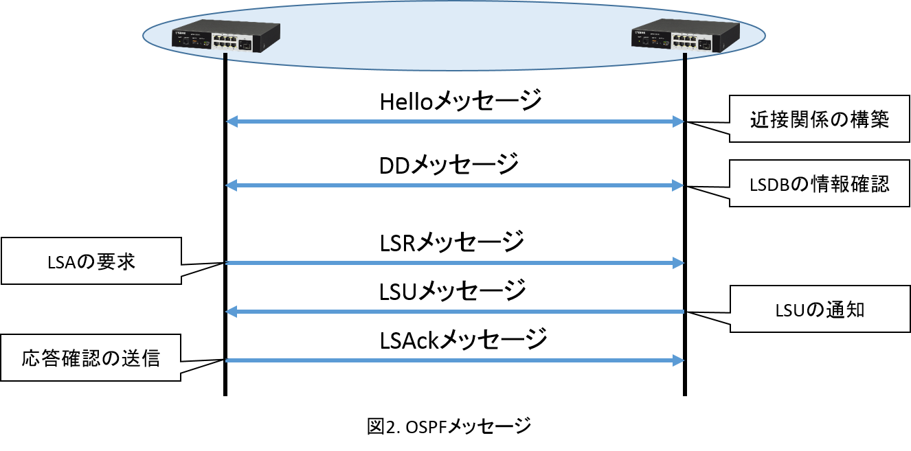 OSPFでは、同じエリアに所属するOSPFルーターの探索や経路情報のやりとりを行うために以下のメッセージを使用します。