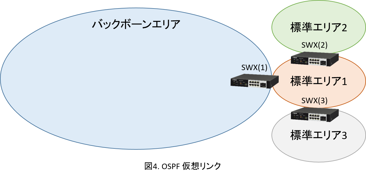 例えば、最初に構築されたOSPFネットワークに対して後からネットワークを追加する場合には、必ずしもバックボーンエリアに直接接続させる必要はなく、最寄の標準エリアに接続させて仮想リンクを用いることでバックボーンエリアと論理的に接続する方法を用いることができます。