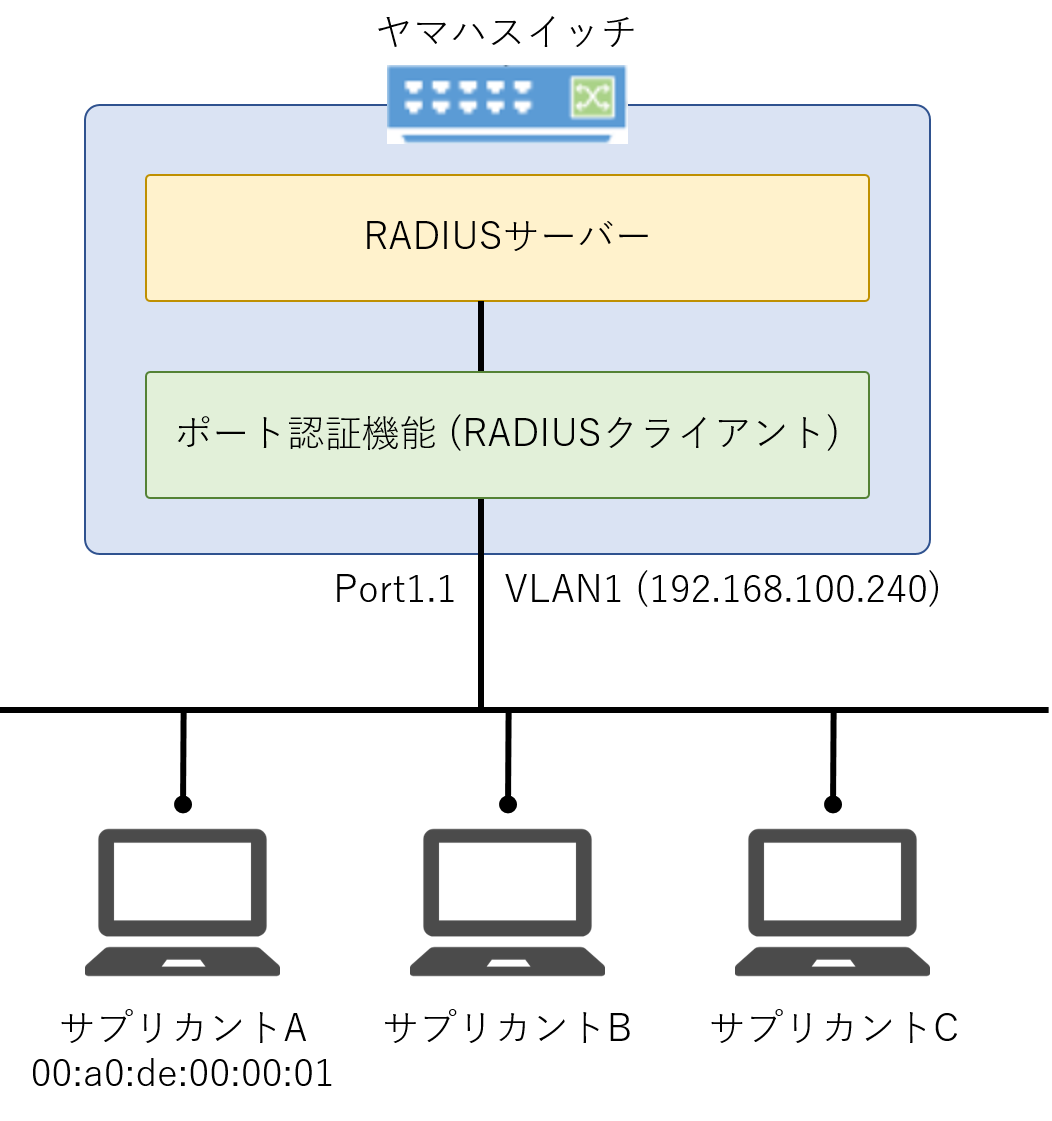 ヤマハ無線アクセスポイントに接続するサプリカントのMACアドレス認証をヤマハスイッチのRADIUSサーバーで行います。