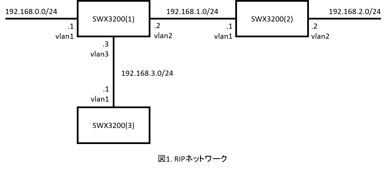 RIPの基本設定を行う上で参考とするネットワークは以下のとおりです。