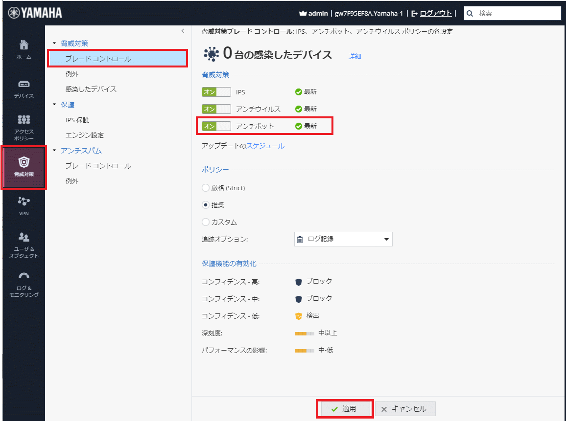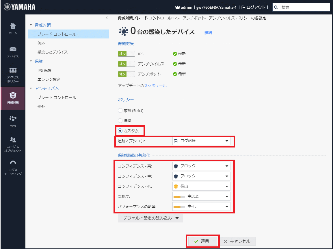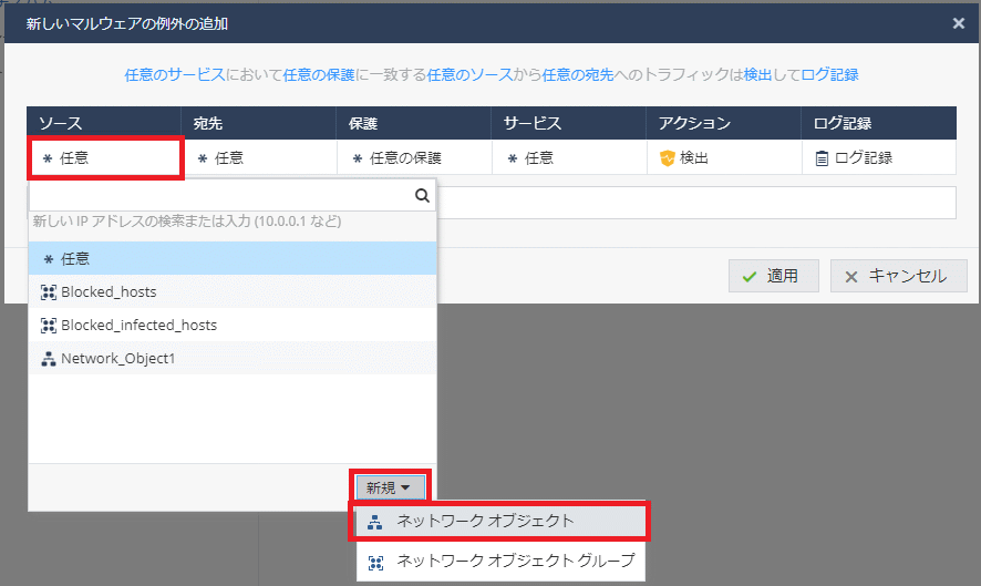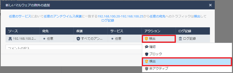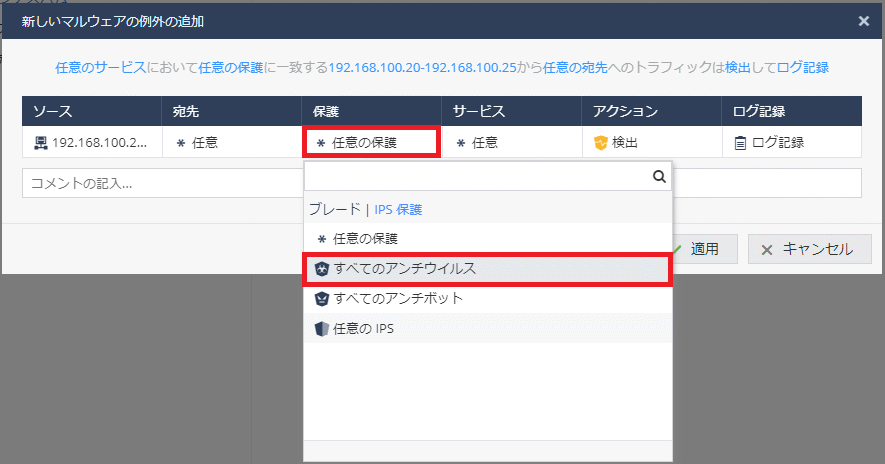 | 任意の保護 | アンチウイルス、アンチボット、IPSの検知が対象です |