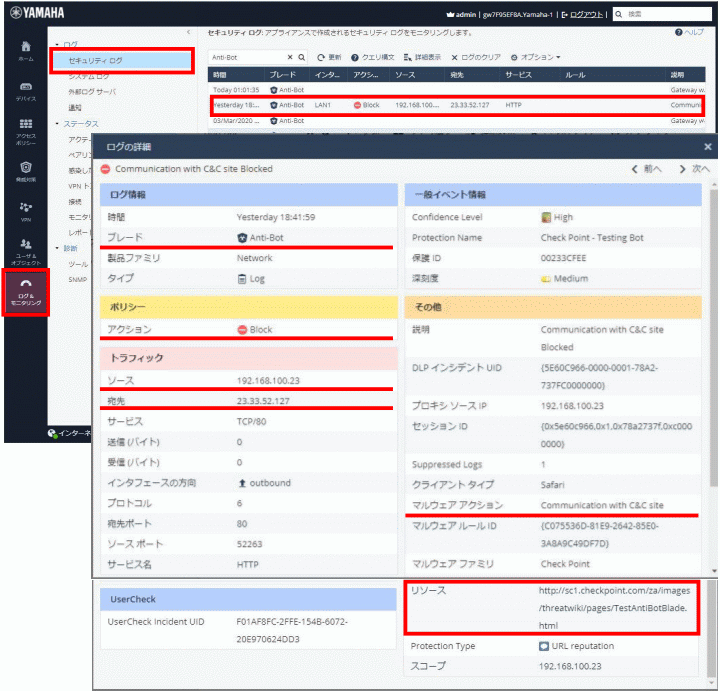 この時、UTXでは Detect(検出)のみを実施し、Block(遮断)はしませんが、実際のサーバーへの通信が発生した際には改めてアンチボット機能が検知するようになっています。