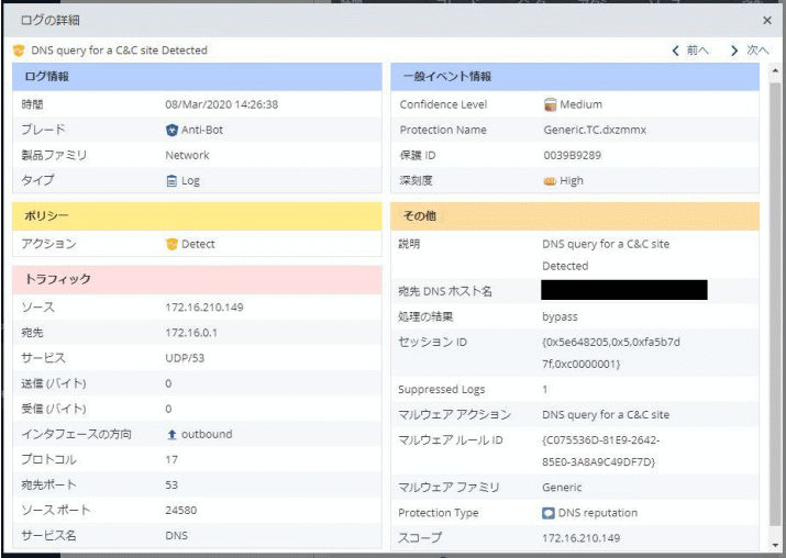 アンチボットを有効にしていると「DNS query for a C&C site Detected」というログが出る場合があります。これは検査対象の端末がC&Cサーバーのドメインを名前解決しようとした際に出力されるものです。