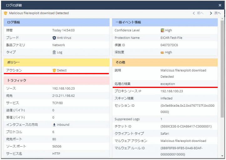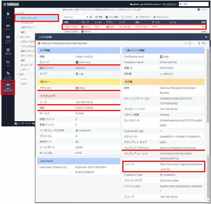 このログでは「http://www.eicar.org/download/eicar_com.zip」宛であることを表しています。