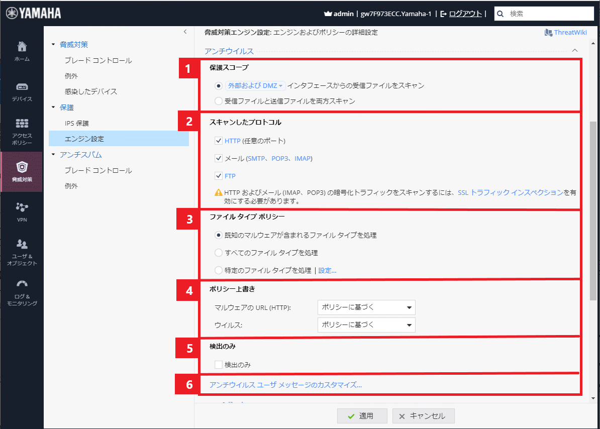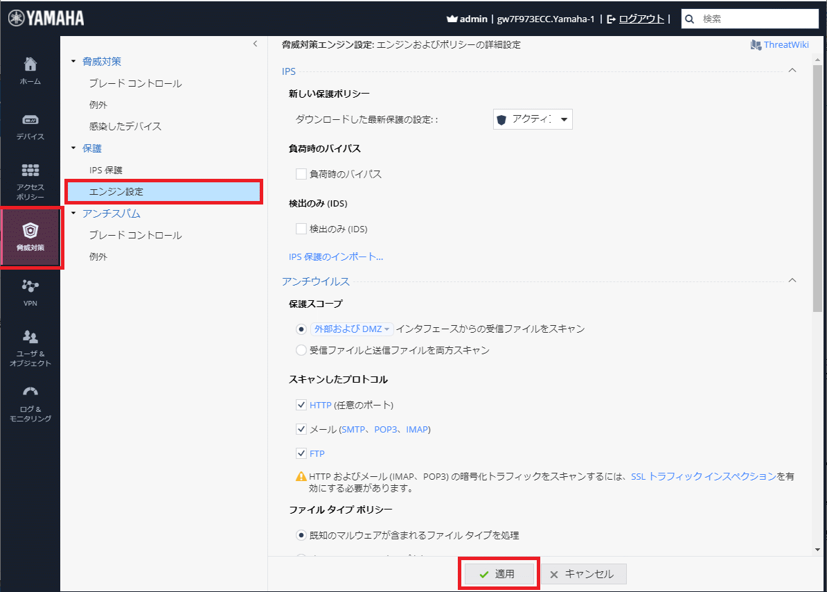 - 【脅威対策】 > 【保護】 > 【エンジン設定】 とメニューを開きます