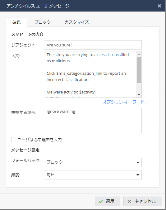 接続をブロックした時に表示されるメッセージのカスタマイズができます(日本語には対応していません)