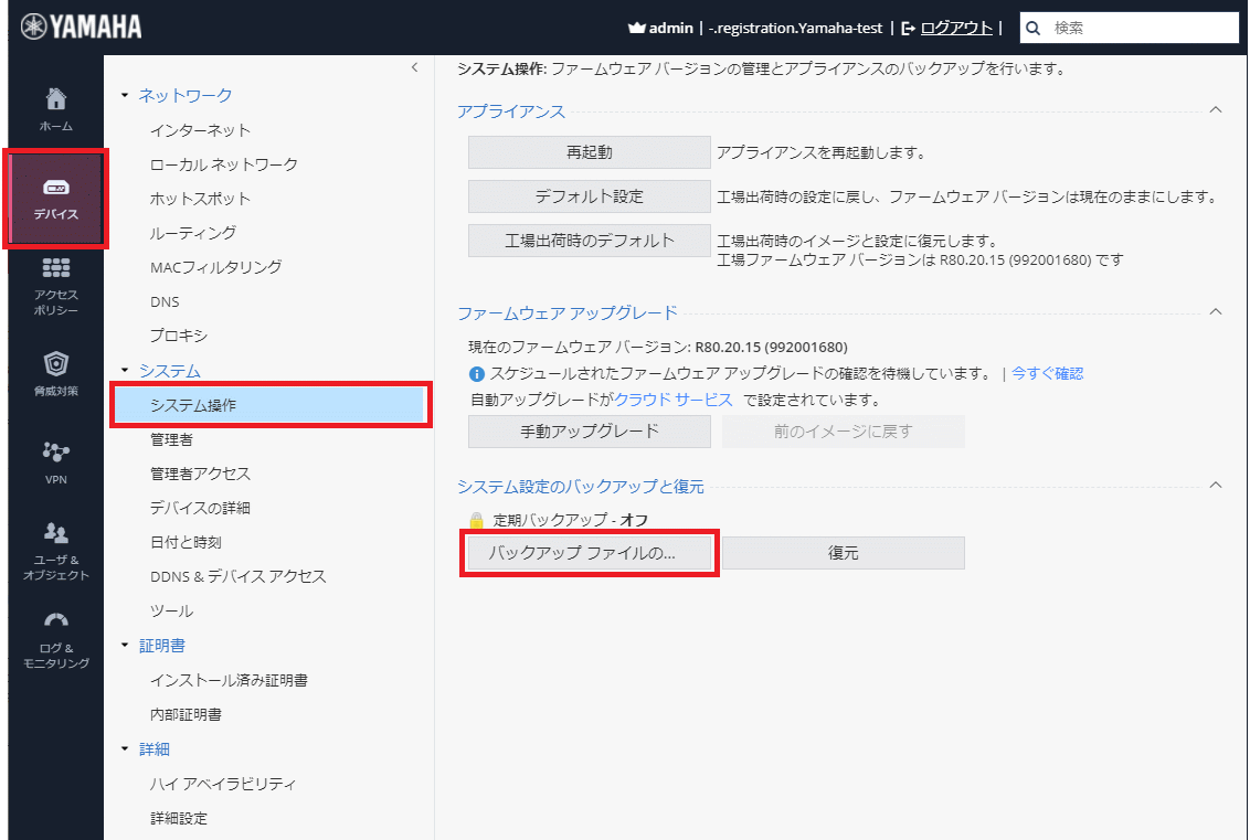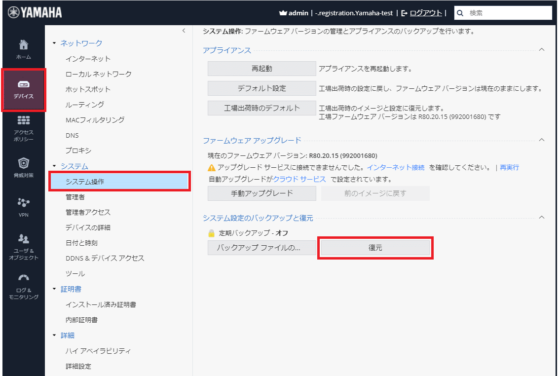 | 「バックアップ元の機器」と「復元先の機器」の<機種>と<ホットフィックスビルド番号までを含んだファームウェアバージョン>が一致している必要があります。 |