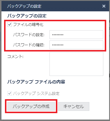 ※「ファイルの暗号化」にチェックを入れ、パスワードを設定することで、バックアップファイルを暗号化することができます