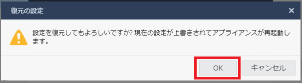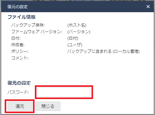 ※ バックアップファイルのビルドバージョン番号が異なる場合でも復元作業自体は完了しますが、内部データベースの整合性の影響などにより、正しいパスワードを入力しても機器にログインができない等の事象が発生することがあります。