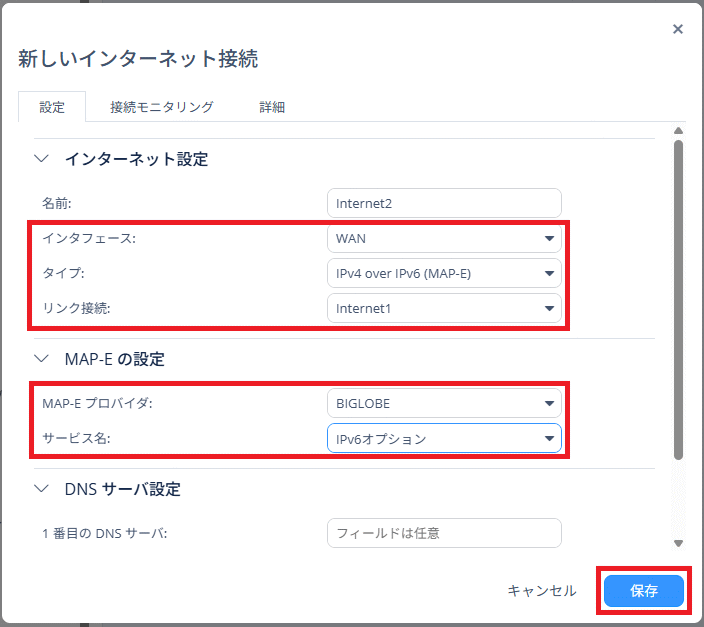 | インタフェース | WAN(その他のインターフェースを使いたい場合、プルダウンから選択) |