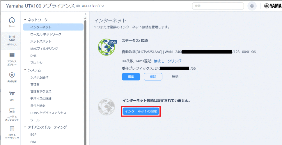 利用しているホームゲートウェイが【RA】/【DHCPv6-PD】どちらに対応しているかが分からない時は、UTXのIPv6インターネット接続設定の接続ステータスにより判別することも可能です。