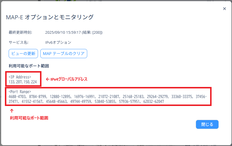 MAP-Eによるインターネット接続が確立した後であれば、「MAP-E オプション」ダイアログを開くことで、以下の情報を確認することができます。