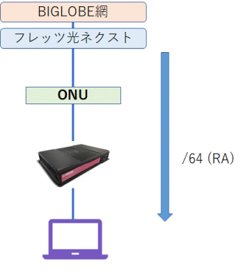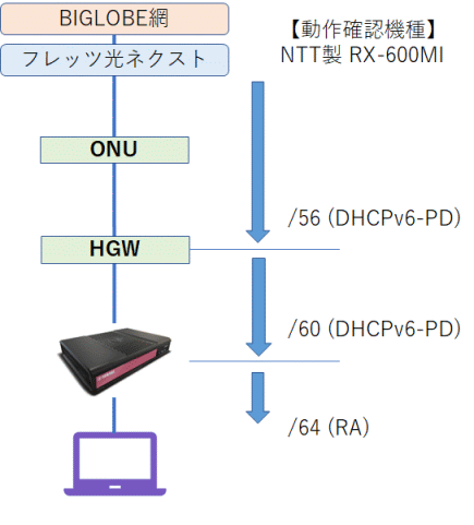 BIGLOBE網からDHCPv6-PDで /56 のプレフィックスがHGWに割り当てられ、HGWからはRAで /64 のプレフィックス(取得した /56 の先頭 /64)が広告されます。