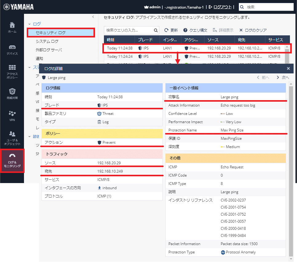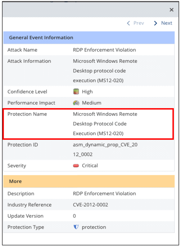 IPSブレードは、危険性(脆弱性)がある判断とした通信をブロックし、「Protection Name」欄にその内容を記します。