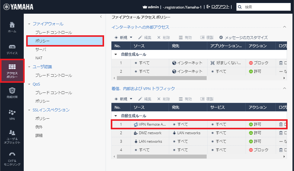 VPN接続端末から社内への着信ポリシーは自動生成されます。