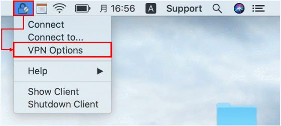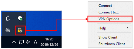 - タスクバーよりVPNクライアントアイコンを右クリックし、【VPNオプション】を開きます