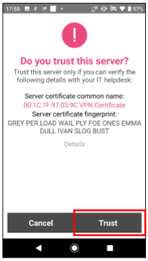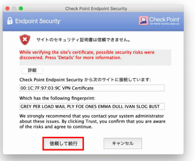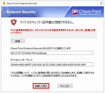 - 接続確認画面が表示後、セキュリティ証明書の確認画面が表示されますので、【信頼して続行】をクリックします