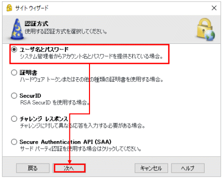 - 「ユーザ名とパスワード」が選択されていることを確認し、【次へ】をクリックします