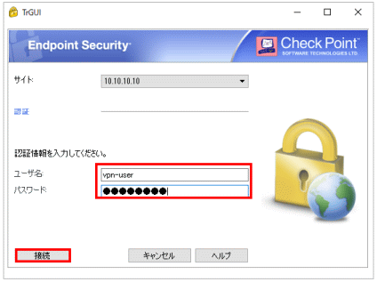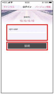 - 【1-2 「リモートアクセスユーザ」の設定】にて設定したユーザ名とパスワードを入力し、【接続】をクリックします