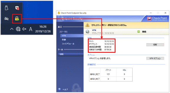 - タスクバーのVPNクライアントアイコンの表示が接続中(緑の丸)に変わったことを確認します