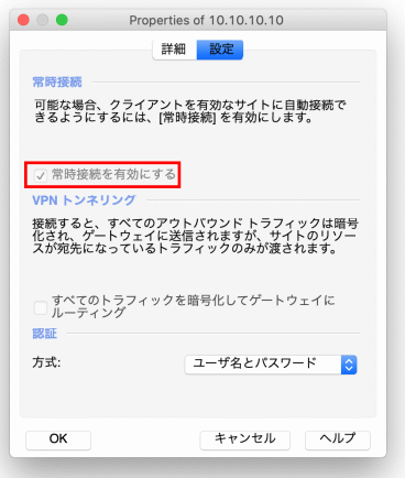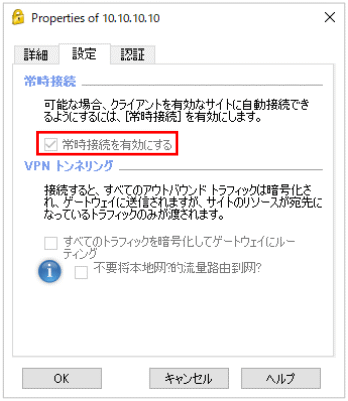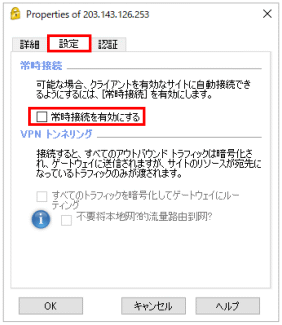 ※ 以下のように、「常時接続を有効にする」の項目がグレーアウトしている場合、一度VPN接続を確立してから再度ご確認ください。一度もVPN接続がされていない場合、本設定を解除することはできません。