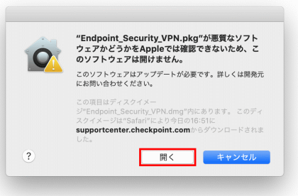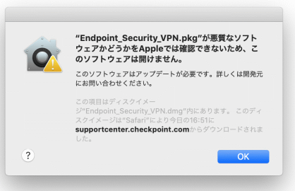 macOS のセキュリティ機能により【Endpoint_Security_VPN.pkg】が実行できない場合があります。以下のようなメッセージが表示された場合、次の手順に従って実行を許可してください。