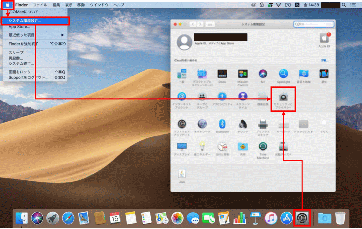- 左上の Apple メニュー、またはDock 上から【システム環境設定】を開きます