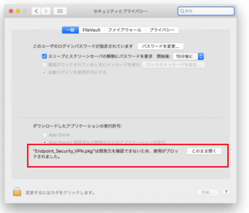 - 「“Endpoint_Security_VPN.pkg”は開発元を確認できないため、使用がブロックされました。」とメッセージが表示されていたら、右側の【このまま開く】をクリックします