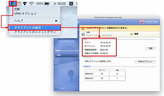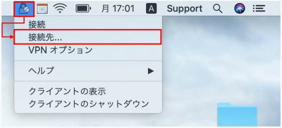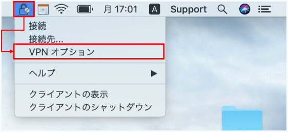 - メニューバーのVPNクライアントの表示が接続中(緑の丸)に変わったことを確認します