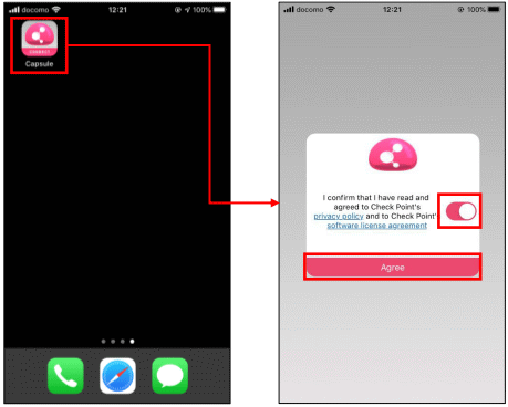 - 【Capsule】を起動し、利用規約「I confirm that I have…」にチェックし【Agree】をタップします
