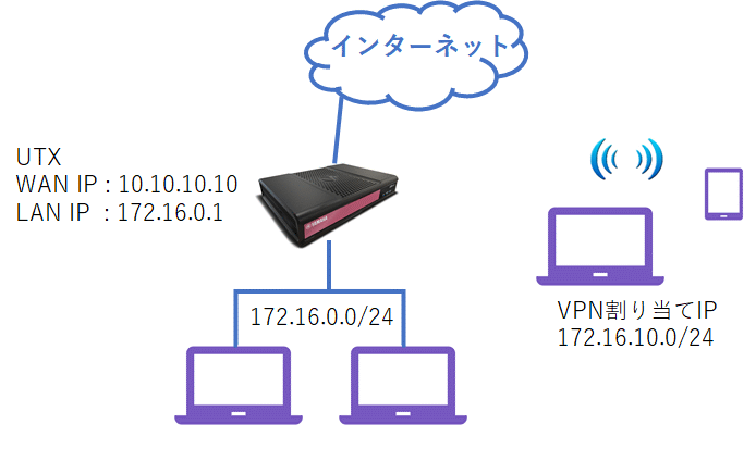 ※ UTXのLAN側ネットワークアドレスのIPアドレスと同じセグメントのIPアドレスを、リモートアクセス向けに割り振る設定には対応しておりません。