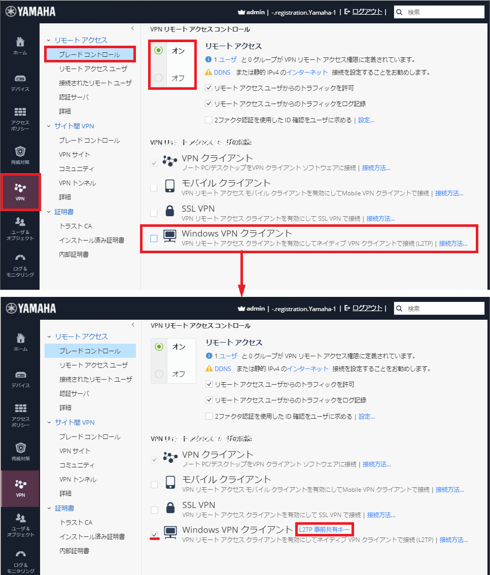 - 【WindowsVPNクライアント】のチェックボックスにチェックを入れ「L2TP 事前共有キー」をクリックします
