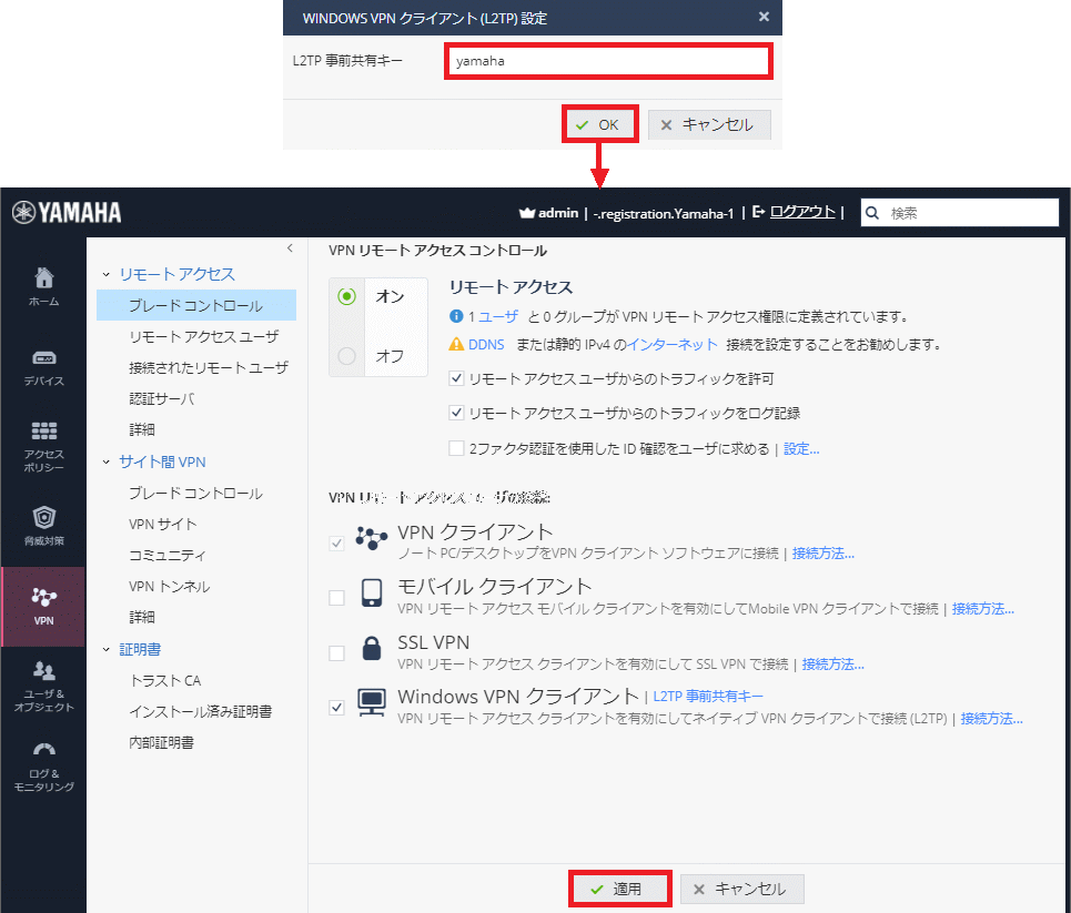 - 「1-2. リモートアクセスの有効化」で設定した事前共有キーを入力します