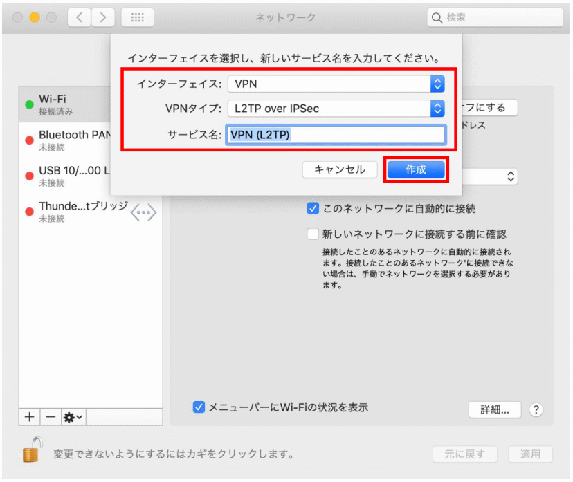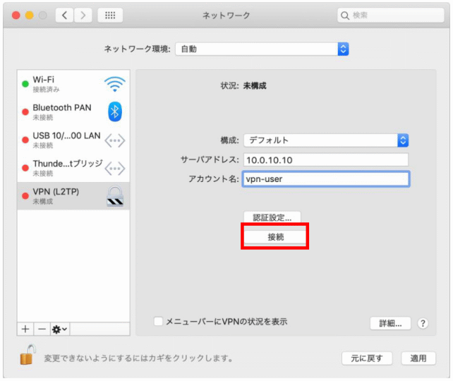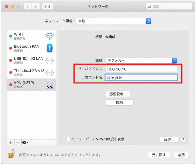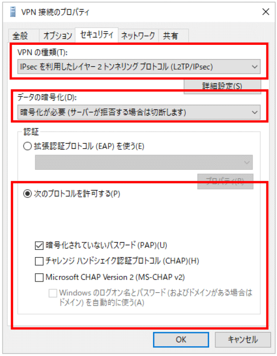 | VPNの種類 | IPsecを利用したレイヤー2トンネリングプロトコル(L2TP/IPSec) |