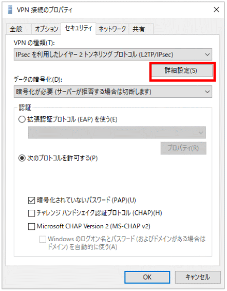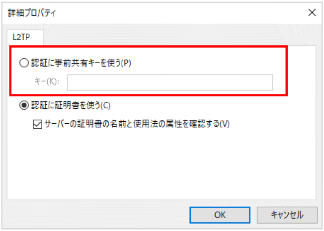 - 【詳細プロパティ】の画面で【認証に事前共有キーを使う】を選択します
