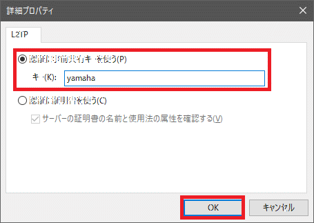 - L2TP 事前共有キーの入力ボックスが開くため、任意の事前共有キーを登録します