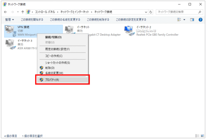 - 【VPN 接続】が作成されますので、アイコンを右クリック後【プロパティ】をクリックします