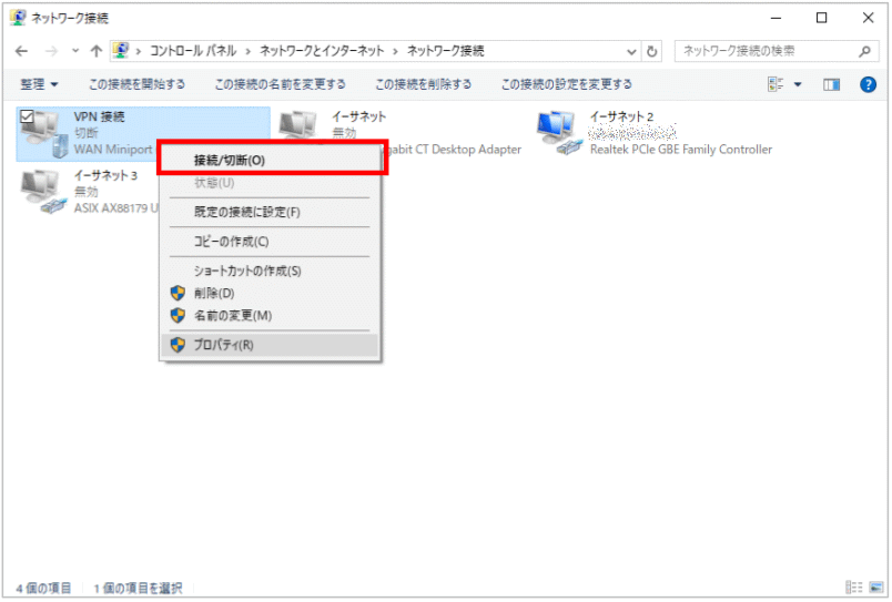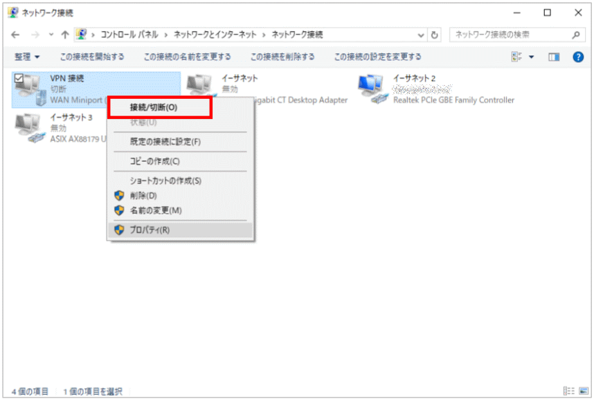 - 【ネットワーク接続】一覧より、設定が完了した【VPN 接続】を右クリックし【切断】をクリックします