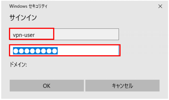 - VPN 接続画面が表示されるので、リモートアクセスユーザの【ユーザ名】と【パスワード】を入力し、【OK】をクリックします