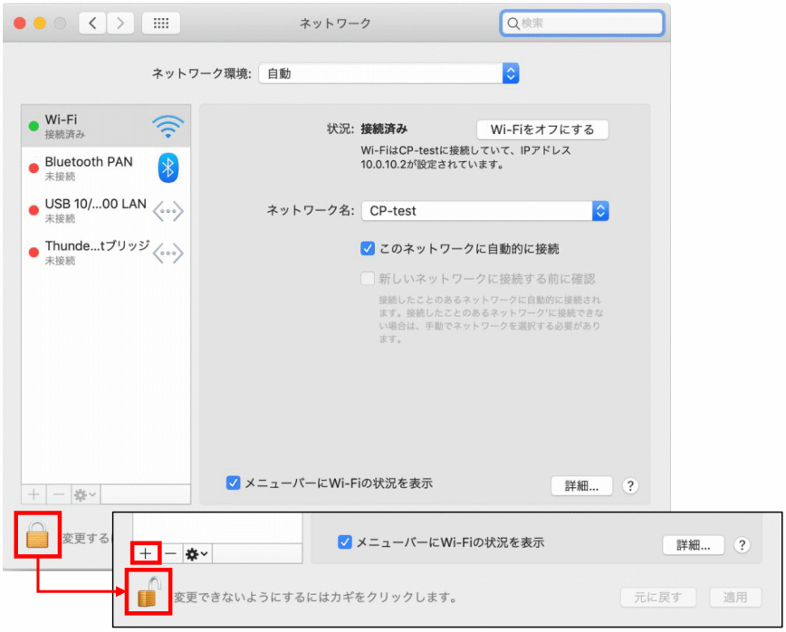- 【システム環境設定】 > 【ネットワーク】を開き、画面左下の鍵マークをクリックします