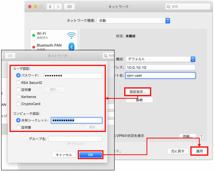 | シークレット | 1-2で設定した「L2TP 事前共有キー」 |